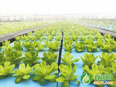 明亮寬敞的玻璃溫室里,十幾個(gè)長方形水池一字排開,水池里漂浮著藍(lán)色泡沫板。泡沫板上,均勻地分布著18個(gè)乒乓球大的圓孔。一棵棵生菜從圓孔里綻放出嫩嫩的綠芽,乍一看,好似漂浮在水面上……