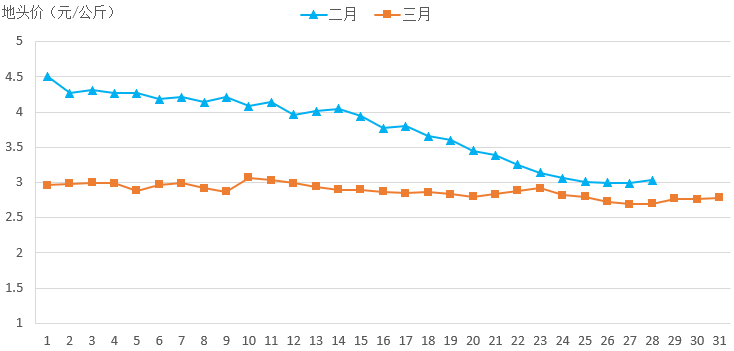 一是平均地頭價(jià)走勢企穩(wěn)。受春節(jié)后消費(fèi)需求下降、氣溫回升蔬菜產(chǎn)品供應(yīng)量增加、種植面積同比增加等因素影響,2月份全國蔬菜平均地頭價(jià)出現(xiàn)明顯下降,從月初的4.51元/公斤降至月末的3.03元/公斤,降幅32.8%。3月份,全國蔬菜生產(chǎn)進(jìn)入冬春蔬菜與夏季蔬菜倒茬季節(jié),加之3月上中旬低溫陰雨天氣影響了長江中下游等地區(qū)蔬菜生產(chǎn)和采收,供應(yīng)量有所下降,平抑了地頭價(jià)快速下滑的勢頭。3月31日,全國蔬菜平均地頭價(jià)2.78元/公斤,比3月1日的2.96元/公斤下降6.08%。
