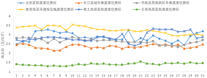 二是各主產(chǎn)區(qū)差異明顯。從價(jià)格水平看,黃淮海與環(huán)渤海設(shè)施蔬菜優(yōu)勢區(qū)平均地頭價(jià)3.26元/公斤,明顯高于其他優(yōu)勢區(qū),主要原因是設(shè)施生產(chǎn)以價(jià)位相對(duì)較高的茄果類蔬菜為主。云貴高原夏秋蔬菜優(yōu)勢區(qū)平均地頭價(jià)1.40元/公斤,明顯低于其他優(yōu)勢區(qū),主要原因是本地區(qū)多以葉菜為主,價(jià)格相對(duì)較低。從月內(nèi)走勢看,云貴高原夏秋蔬菜優(yōu)勢區(qū)、長江流域冬春蔬菜優(yōu)勢區(qū)、黃淮海與環(huán)渤海設(shè)施蔬菜優(yōu)勢區(qū)、華南與西南熱區(qū)冬春蔬菜優(yōu)勢區(qū)等4個(gè)優(yōu)勢區(qū)蔬菜平均地頭價(jià)走勢平穩(wěn),黃土高原夏秋蔬菜優(yōu)勢區(qū)、北部夏秋蔬菜優(yōu)勢區(qū)等2區(qū)波動(dòng)較大,主要原因是夏季蔬菜上市初期的上市量不穩(wěn)定,所以價(jià)格波動(dòng)比較大。