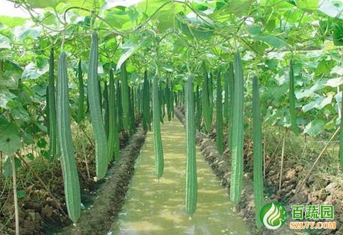 8、理瓜:開花結(jié)果期間,如幼瓜被棚架、葉片、蔓等阻礙不能自然下垂時容易變彎,因此要及時進(jìn)行理瓜,使之垂直懸掛于棚架內(nèi),提高絲瓜的商品性。